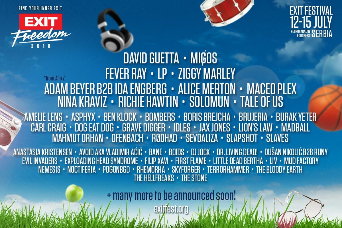 EXIT festival biće održan od 12. do 15. jula na Petrovaradinskoj tvrđavi u Novom Sadu i predstaviće neke od najtraženijih svetskih zvezda kao što su Migos, David Guetta, Ziggy Marley, Fever Ray, LP, Alice Merton, Nina Kraviz, Richie Hawtin, Adam Beyer b2b Ida Engberg, Maceo Plex, Solomun, Amelie Lens, Ben Klock, Jax Jones, Ofenbach, Mahmut Orhan, Carl Craig, Tale of Us, Sevdaliza, Burak Yeter, Madball, Brujeria, Ofenbach, Slapshot, Dog Eat Dog, Slaves, Idles, Asphyx, Bombers i mnoge druge. Ulaznice po promotivnoj ceni sa 65% popusta od finalne, za 6.490 dinara prodaju se onlajn putem sajta exitfest.org, a na sajtu zvanične turističke agencije exittrip.org dostupni su i turistički paketi koji pored ulaznica, sadrže i opcije za smeštaj i prevoz do EXIT festivala.