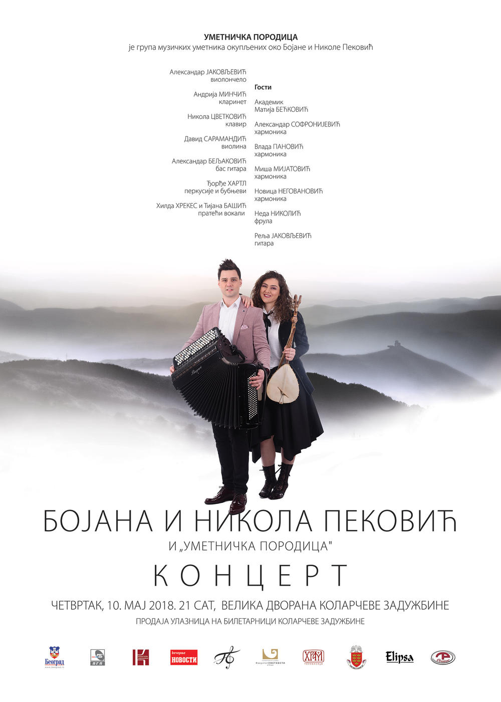 Bojana i Nikola Peković, pobednici globalnog TV šou programa „Ja imam talenat“ (2012), održaće 10. maja 2018. godine sa svojom grupom „Umetnička porodica“ koncert u velikoj dvorani Kolarčeve zadužbine u Beogradu, sa početkom u 21 sat.