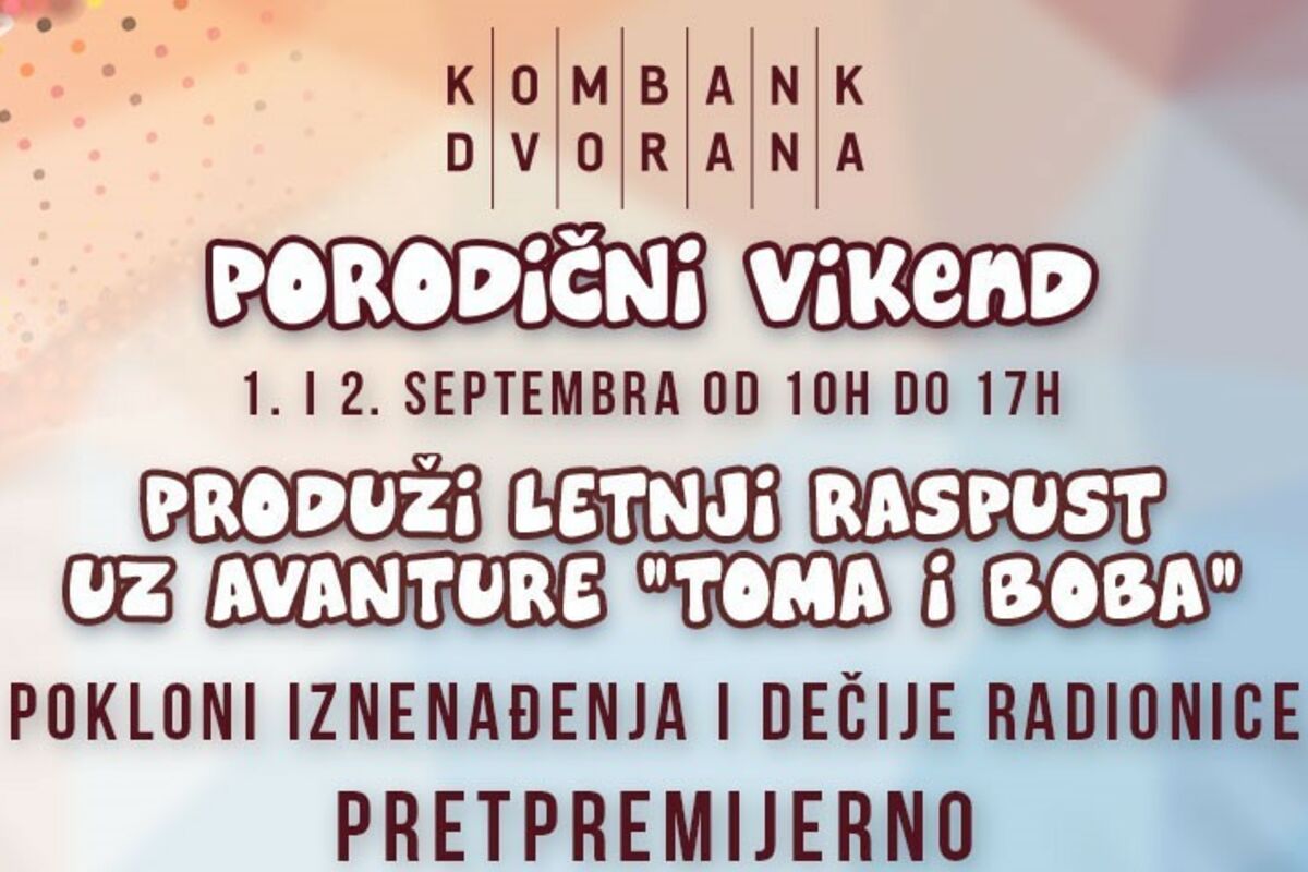 Prvog septembarskog vikenda u Kombank dvorani biće održan tradicionalni Porodični vikend pod sloganom „Produži letnji raspust uz avanture Toma i Boba“. Od 10h do 17h školarci, ali i oni najmlađi moći će sa svojim roditeljima da uživaju u nezaboravnoj filmskoj zabavi uz najnovije naslove iz sveta animacije.