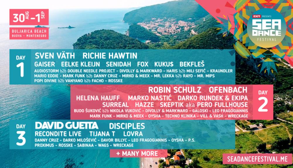 Dok poznata crnogorska blogerka Jelena Kaluđerović izdvaja nastup nove balkanske trap dive Senidah, Jutjuber Marko Inić Yasserstain nakon, kako kaže, brutalnog provoda prošle godine u Buljarici, raduje se novosadskom hip-hop sastavu Bekfleš. Desetine hiljada ljudi, mnoštvo stejdževa i sjajna atmosfera razlozi su zbog kojih je novinarka i TV lice Iris Polumenta rezervisala kraj leta za Sea Dance, a njen kolega i stand up komičar Igor Šuković poziva na provod “kao nikada do sad”. Najslušanije hitove današnjice, savremene hip-hop bitove i vrhunske DJ setove od 30. avgusta do 1. septembra na tirkiznu plažu Buljarica donose najveći svetski producent 21. veka David Guetta, nemački vladar svetskih top-lista Robin Schulz, francuski rock-house tandem Ofenbach, britanski hit trio Disciples, kao i techno velikani Sven Väth, Richie Hawtin, Eelke Kleijn, Helena Hauff, Recondite i drugi regionalni asovi kao što su Darko Rundek, Senidah, Surreal, Tijana T, Marko Nastić i desetine ostalih. Ogromno interesovanje iz celog sveta vlada za ovogodišnje izdanje najvećeg crnogorskog festivala. Paket ulaznica za sva tri festivalska dana košta 3.590 dinara, što predstavlja uštedu od 40% u odnosu na finalnu cenu. U prodaji su i jednodnevne ulaznice koje za prvi i drugi dan iznose svaka po 1.990 dinara, dok je cena za treći dan 2.390 dinara.