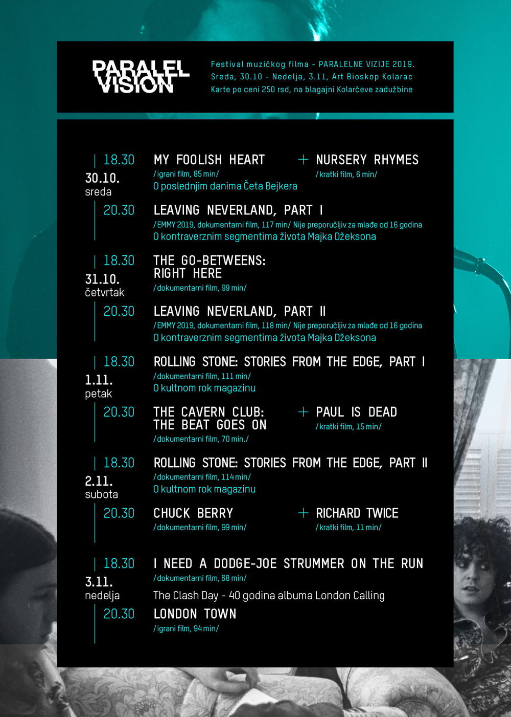 Paralelno, tu su i biografije jednog od pionira rokenrola Čaka Berija ("Chuck Berry"), zatim australijskog benda Goubitvins ("The Go Betweens - Baš ovde"), kao i odličan dokumentarac sa igranim elementima o španskim danima frontmena grupe Kleš, Džoa Stramera ("Joe Strummer on the Run").