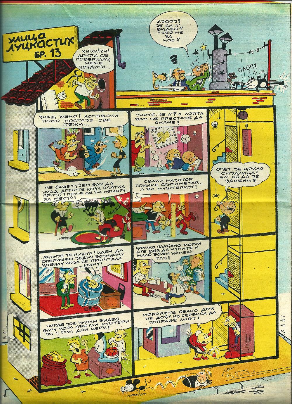 10. Ulica luckastih 13 (13 Rue Del Percebe) Španski autor Francisko Ibanez stvorio je veoma originalni komični kratki strip o stambenoj zgradi u kojoj svaki kvadrat predstavlja dešavanja u po jednom stanu. Ovaj strip je kod nas izlazio sedamdesetih i osamdesetih u Politikinom Zabavniku, a dobio je i neobičan omaž u vidu ilustrovanog Kućnog reda koji je srpski ilustrator Bob Živković izradio po porudžbini Grada Beograda.