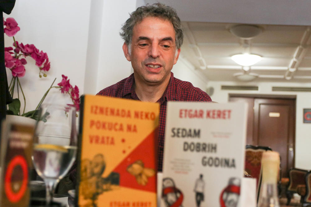 Nisam ni slutio da će mi se jednog dana ukazati prilika da se upoznam sa njim, kao i da uradim intervju koji je više podsećao na prijateljsko ćaskanje, a manje na konvencionalni razgovor za medije. Keretu sam na poklon doneo domaću srpsku kajsijevaču i bukmarker sa motivima Svetog Jovana, što ga je baš, meni je delovalo, obradovalo pa smo potom uz kafu proveli gotovo sat vremena pretresajući, na engleskom, razne teme vezane za njegov veoma zanimljiv život i karijeru, a povod nam je bilo njegovo gostovanje na Noći knjige, te promocija knjiga koje je objavila beogradska Laguna - "Iznenada neko pokuca na vrata" i "Sedam dobrih godina". Inače, Keret se pokazao kao vrlo spontan, komunikativan i opušten lik, nimalo nadmen; nijedna tema za njega nije tabu, niti na bilo šta gleda s visine, iako bi za to mogao da ima mnoštvo razloga. Pre svega je vedar i iskren tip, veoma nalik na svoje priče.