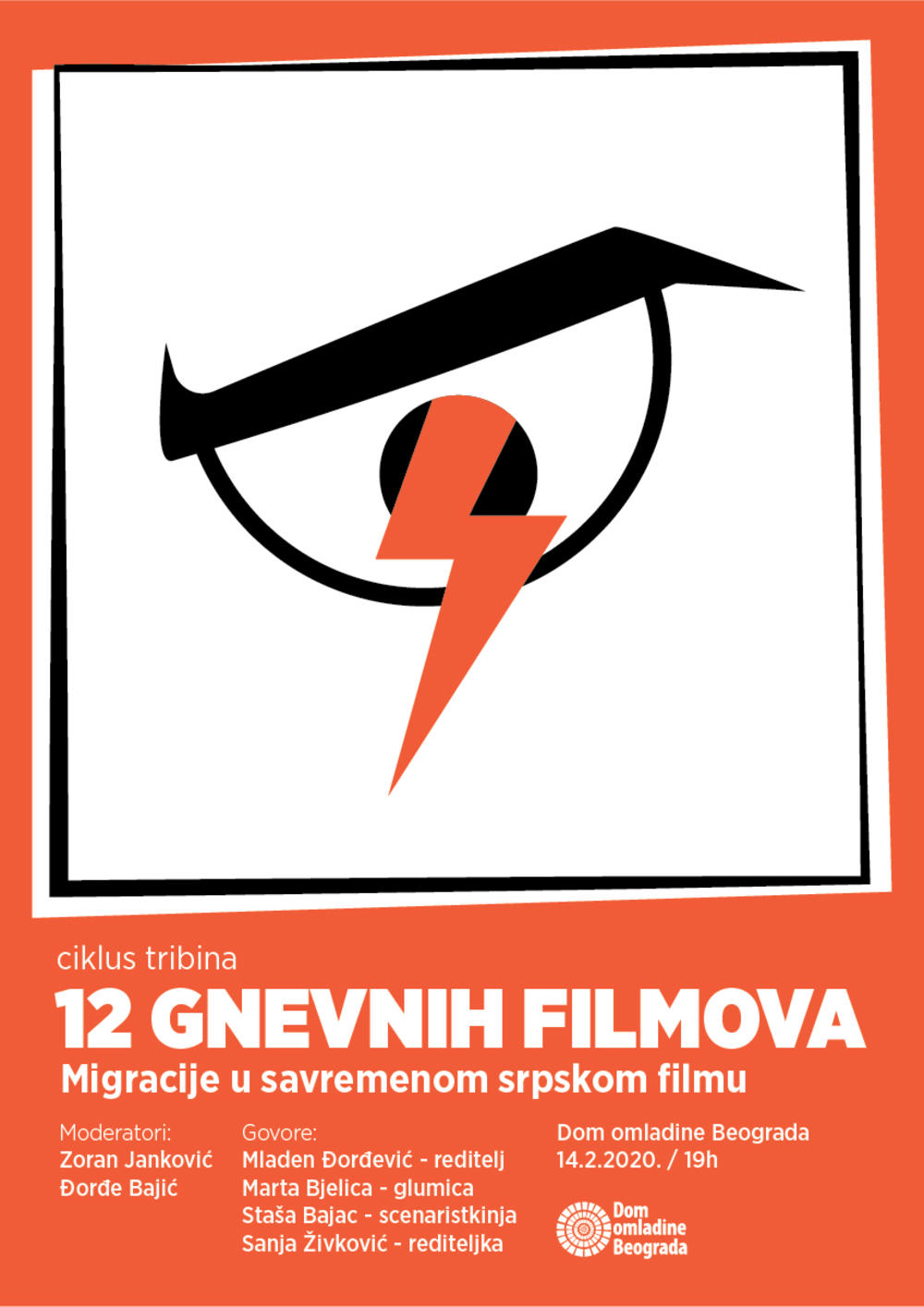 Prva tribina u okviru ciklusa „12 gnevnih filmova“ biće održana u petak, 14. februara 2020. godine, u Tribinskoj sali Doma omladine, a sa početkom u 19 časova. Ulaz je slobodan.