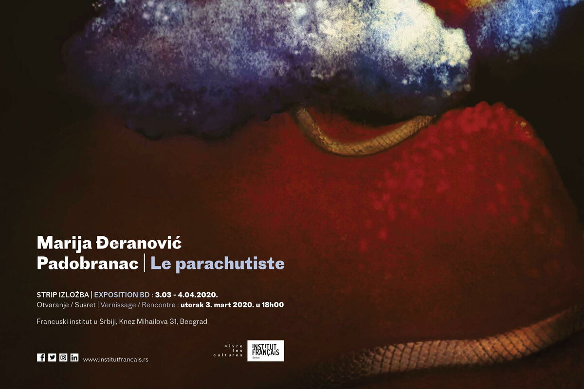 IZLOŽBA “PADOBRANAC” 03/03-04/04/2020 Francuski institut u Srbiji, Knez Mihailova 31 Otvaranje u utorak 3. marta 2020. u 18.00, u prisustvu Marije Đeranović, autorke izložbe i Aleksandra Zografa, strip autora