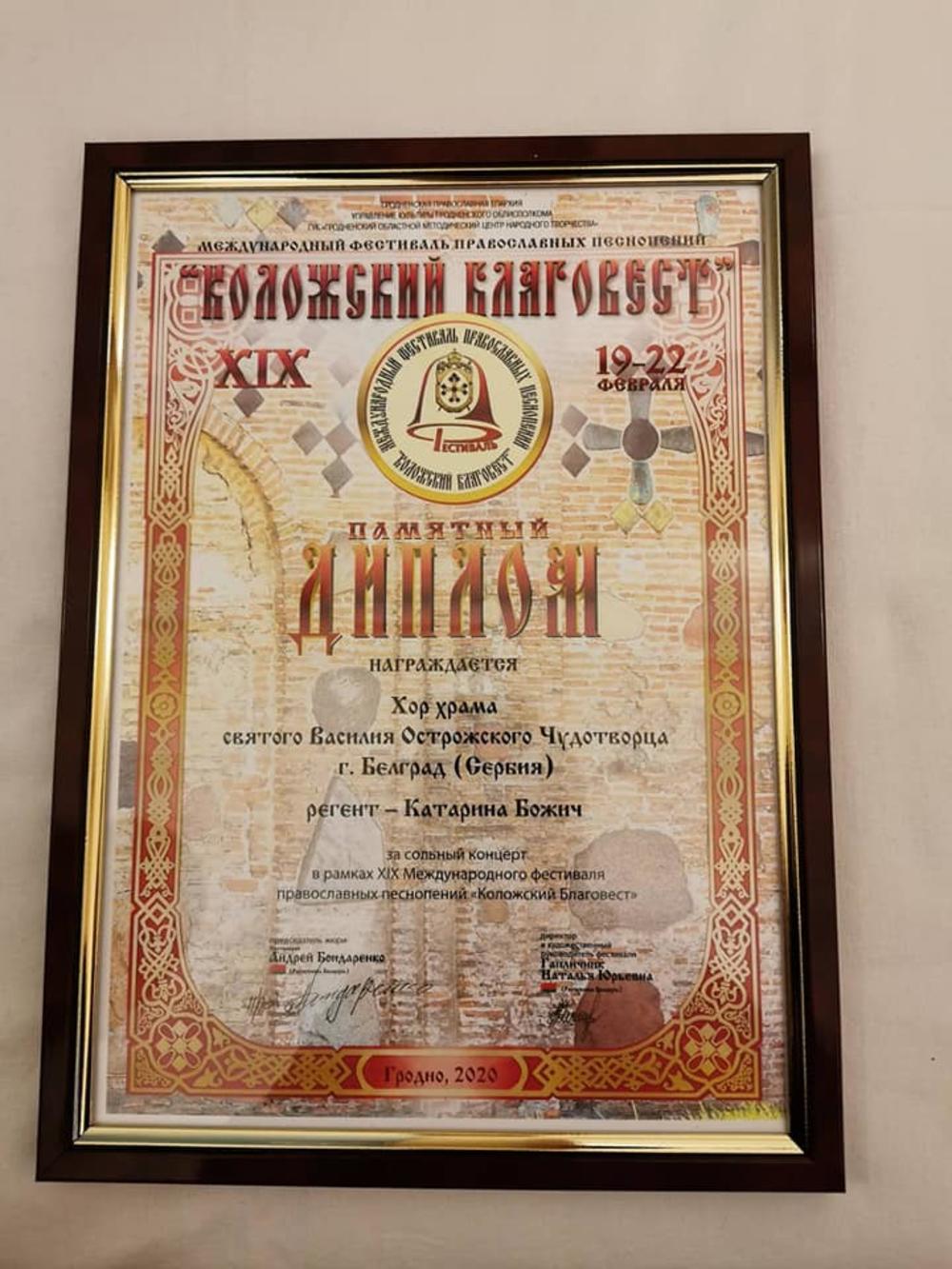 U kategoriji „Crkvenih horova i ansambala regionalnih Pravoslavnih Crkava“, Hor svetog Vasilija Ostroškog Čudotvorca je nagrađen nagradom Prvog stepena, a dirigentkinja i solistkinja Katarina Božić dobila je specijalnu nagradu za najboljeg solistu