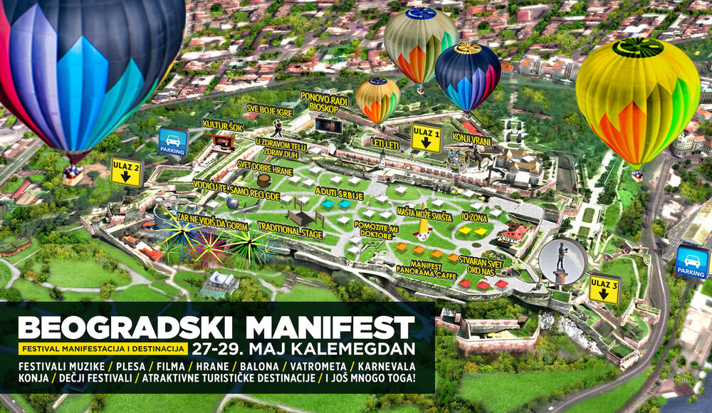 Beograđane i goste glavnog grada ovog vikenda na Kalemegdanu očekuje najšareniji i najzabavniji festival u regionu „Beogradski Manifest“, koji će biti otvoren u petak, 27. maja od 10 časova.Dupla zabava: Uz Exit kartu na Juliette Lewis i Skunk Anansie na Revolution fest u Temišvaru!Festival velikih šarenih balona i Festival vatrometa i ove godine će izazvati posebnu pažnju i zanimanje posetilacaMuzički program će se održavati na dve bine i za tri dana će biti izvedeno preko 40 koncerata.Posetioci će na štandu Bunta moći da glasaju za svoje favorite, gde ih očekuju i nagrade, a ovi glasovi biće dodati glasovima publike pri izboru pobednika.foto: PromoU petak će nastupiti Viva Vox, Neverne Bebe i Bvana iz Lagune&Neznani ludaci, a u subotu Frajle, Atomsko Sklonište i E-play. Za večernju zabavu u petak će biti zaduženi Garavi Sokak i grupa Nit, a u subotu atmosferu će do usijanja dovesti Trubači iz Guče i temperamentan bend Kal.foto: PromoU predivnoj atmosferi Kalemegdana u zoni Ponovo radi bioskop najbolji filmski festivali će svako veče organizovati koktele na kojima će predstaviti svoje programe, a u petak u 19.30h jedan od gostiju biće i reditelj Darko Bajić. U dečjoj zoni Mašta može svašta mališani će uživati u pozorišnim predstavama, kreativnim radionicama i pričaonicama, plesnim i slikarskim školicama i još mnogim sadržajima,Za to vreme mogu plesati u zoni Sve boje igre uz zvuke swinga, tanga, jazza, flamenka, hip-hopa, savremene igreSportska zona će biti posvećena olimpijskim sportovima, a organizovaće se i takmičenja na kojima će posetioci moći da osvoje nagrade. Za najbrže koji od 19 sati pošalju mail na idemouprovod@gmail.com smo obezbedili 10x2 karte za subotu i nedelju. Potrebno je da navedete za koji dan biste želeli karte.
