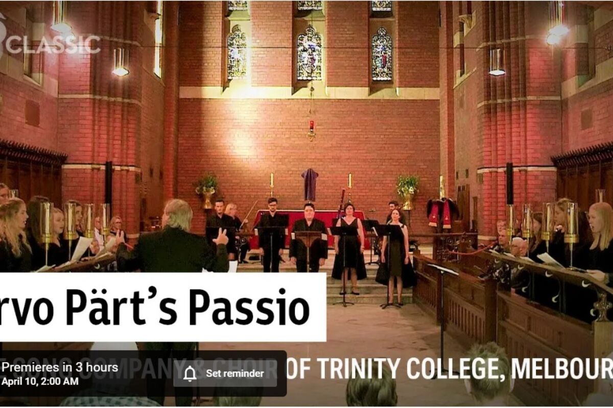 Delo savremenog estonskog kompozitora Arvo Perta "Passio Domini Nostri Jesu Christi secundum Joannem" (Stradanje Gospoda našeg Isusa Hrista prema Jevanđelju po Jovanu) za vokalni kvartet i instrumentalni kvartet, napisano 1982, izvešće melburnski Evangelistički pevački kvartet uz pratnju instrumentalnog kvarteta, u kapeli Triniti Koledža u Melburnu, Australija. Posredstvom kanala ABC Classic publik širom sveta imaće priliku da isprati izvedbu. Muzika ima dramske intervale kada tekst izgovaraju glumci.