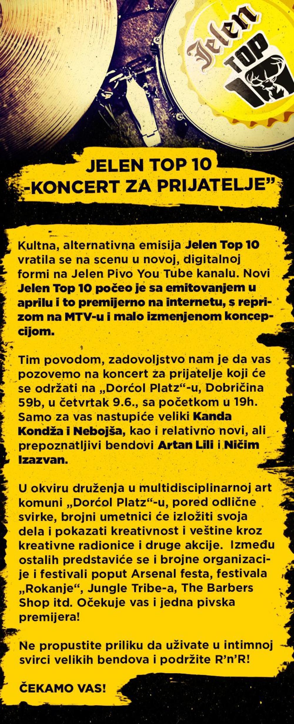 Kultna rok emisija Jelen Top 10 proslavlja svoj povratak na scenu! Tim povodom, u četvrtak 9. juna, u 19 sati, organizujemo koncert u "Dorćol Platz"-u, Dobračina 59b. Nastupiće legendarni Kanda, Kodža i Nebojša i noviji bendovi Artan Lili i Ničim Izazvan.