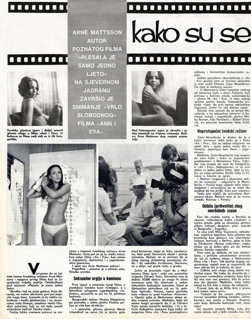 - I zamislite, glavna glumica Marie Liljedahl ne samo što je stalno gola pred kamerom nego se tako, neodjevena, šeta pred članovima ekipe i poslije snimanja. Režiser mi je priznao da je zbog njenog slobodnog ponašanja došlo i do nekoliko incidenata. Naravno, ne u ekipi, već poslije rada, u gradu.