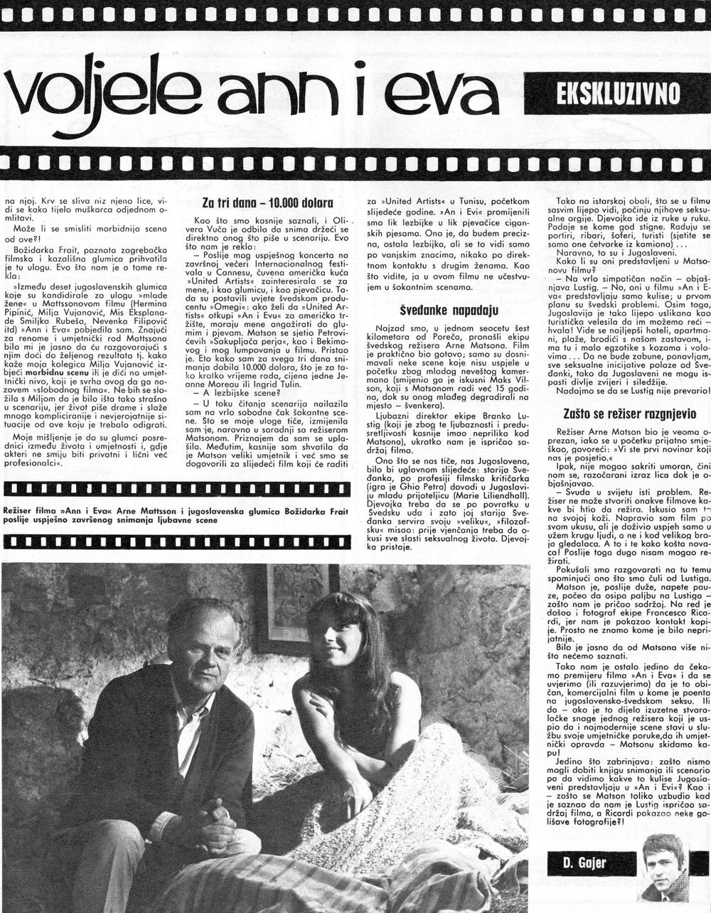 - Na vrlo simpatičan način - objašnjava Lustig. - No oni u filmu "Ann i Eve" predstavljaju samo kulise; u prvom planu su švedski problemi. Osim toga, Jugoslavija je tako lijepo oslikana kao turistička velesila da im možemo reći hvala! Vide se najljepši hoteli, apartmani, plaže, brodići s našom zastavom, ima tu i malo egzotike s kozama i volovima... Da ne bude zabune, ponavljam, sve seksualne inicijative polaze od Šveđanki, tako da Jugoslaveni ne mogu ispasti divlje zvijeri i siledžije.