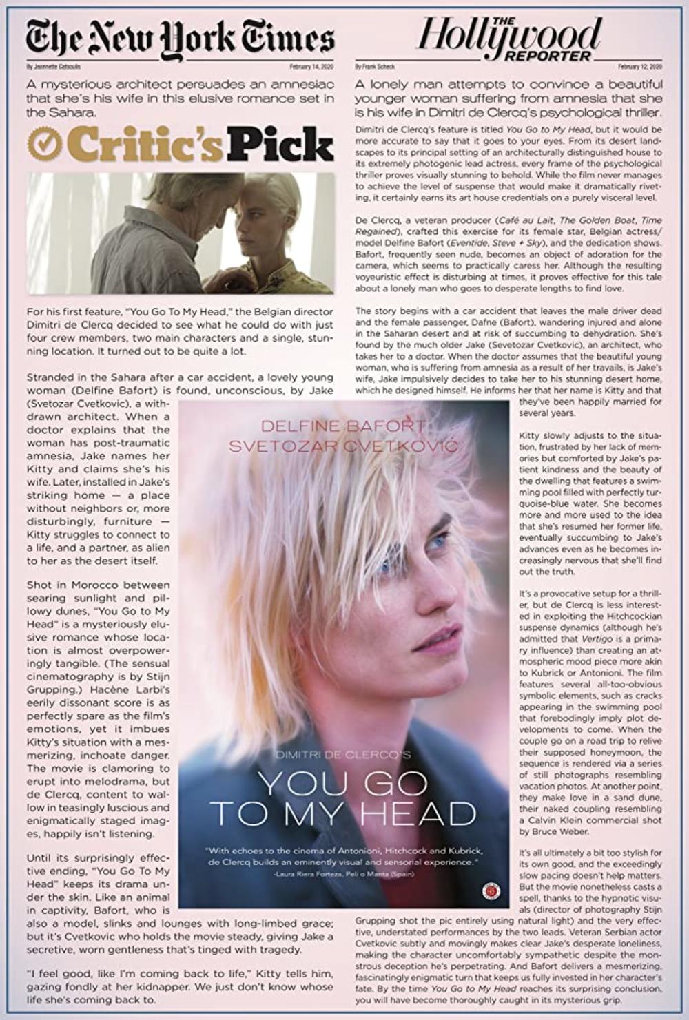 U višestruko nagrađivanom filmu belgijskog reditelja i producenta Dimitri de Clercqa „You Go To My Head“, o usamljenom čoveku koji mladu i lepu ženu koja pati od amnezije, pokušava da ubedi da je njegova supruga, glavna uloga poverena je srpskom glumcu Svetozaru Cvetkoviću nagrađenom Nagradom kritike za najboljeg glumca na 50. filmskom festivalu u Hjustonu (2017.)