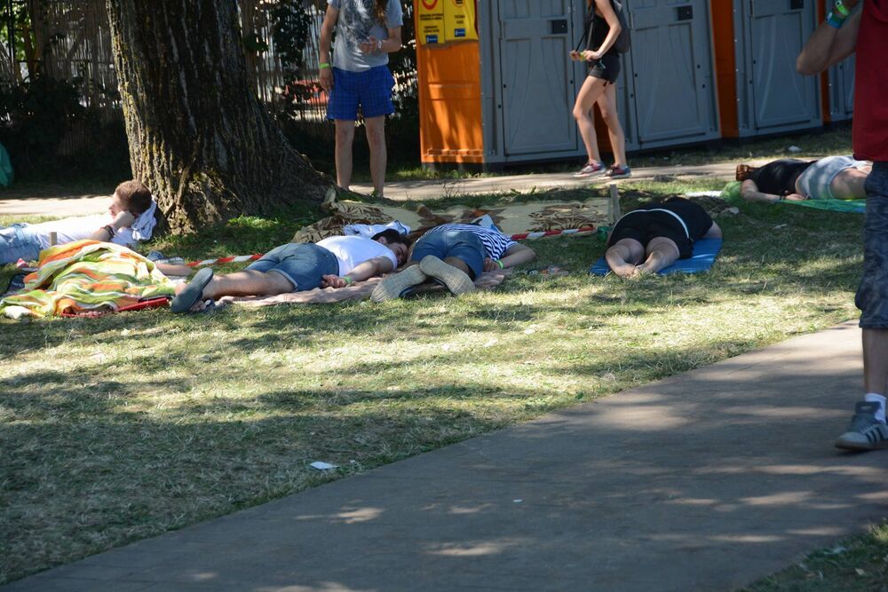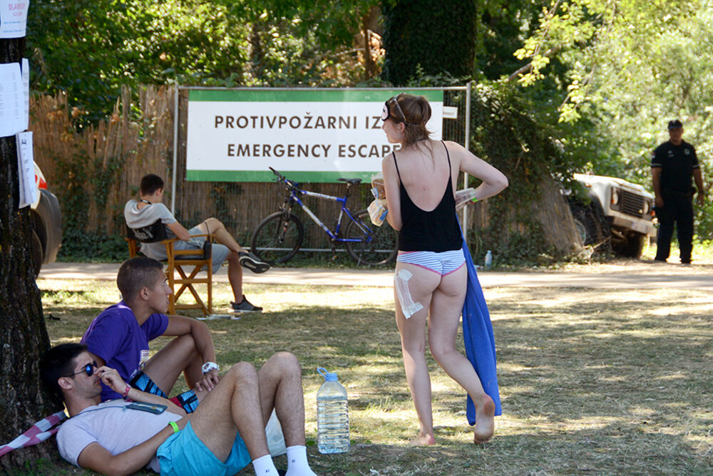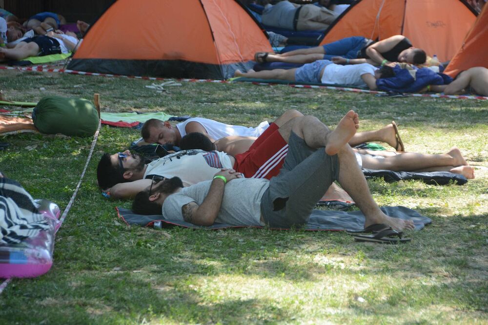 Neki leže na dušecima na naduvavanje, neki na zemlji, a drugi pak ne prave puzu, već su nastavili sa partijanjm i cirkanjem u istom stilu. Ubavo, partija, šega... Sa svih strana čuju se različiti jezici, nemoguće je nabrojati ih na prste.