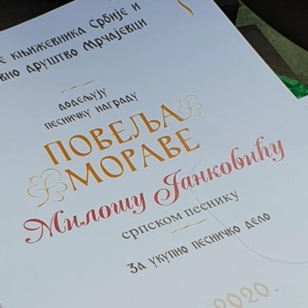 Književniku Milošu Jankoviću (1963), članu osnivaču Udruženja Adligat, istaknutom pesniku mlađe generacije koji u ovoj godini obeležava tridestpetogodišnjicu od objavljivanja prvog dela, danas je uručena četvrta nagrada ove godine – „Povelja Morave“. Nagradu dodeljuju Udruženje književnika Srbije i Književno društvo „Mrčajevci“ tokom Mrčajevačkih susreta.