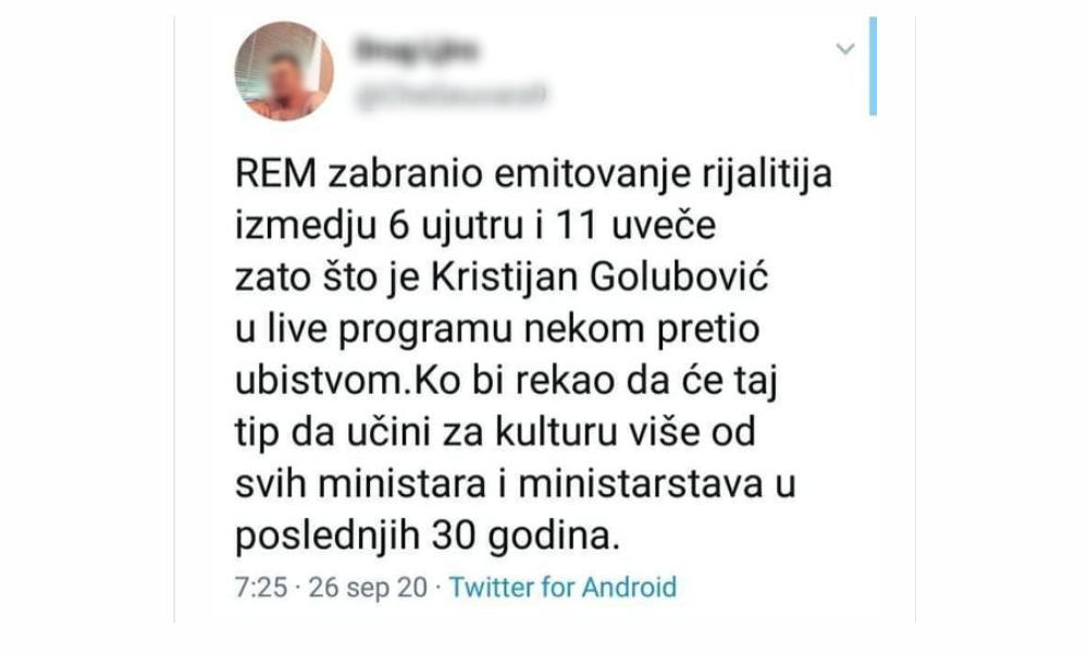 "REM zabranio emitovanje rijalitija između 6 ujutru i 11 uveče zato što je Kristijan Golubović u live programu nekom pretio ubistvom. Ko bi rekao da će taj tip da učini za kulturu više od svih ministara i ministarstava (kulture) u poslednjih 30 godina."