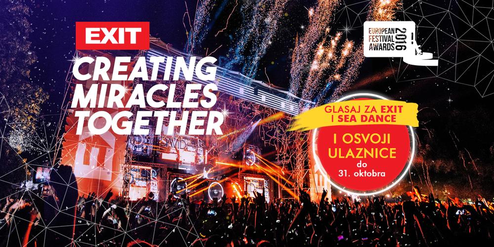 Glasanje za European Festival Awards počinje danas i trajaće do 31. oktobra, a svi koji glasaju automatski učestvuju u nagradnoj igri u kojoj mogu da osvoje VIP ulaznice za festivale koji osvoje ovogodišnje festivalske "Oskare"! Glasa se izborom za EXIT u prvoj kategoriji, “Best Major Festival” i za Sea Dance festival u drugoj kategoriji, “Best Medium-Sized Festival” na ovom linku. I treći festival u okviru EXIT Avanture, Revolution u Temišvaru, nominovan je u čak dve kategorije, za najbolji mali festival, kao i za najbolji novi festival!