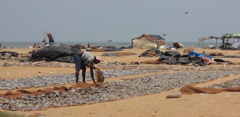 plaže, a na njimu riba koja se suši i priprema za prodaju.