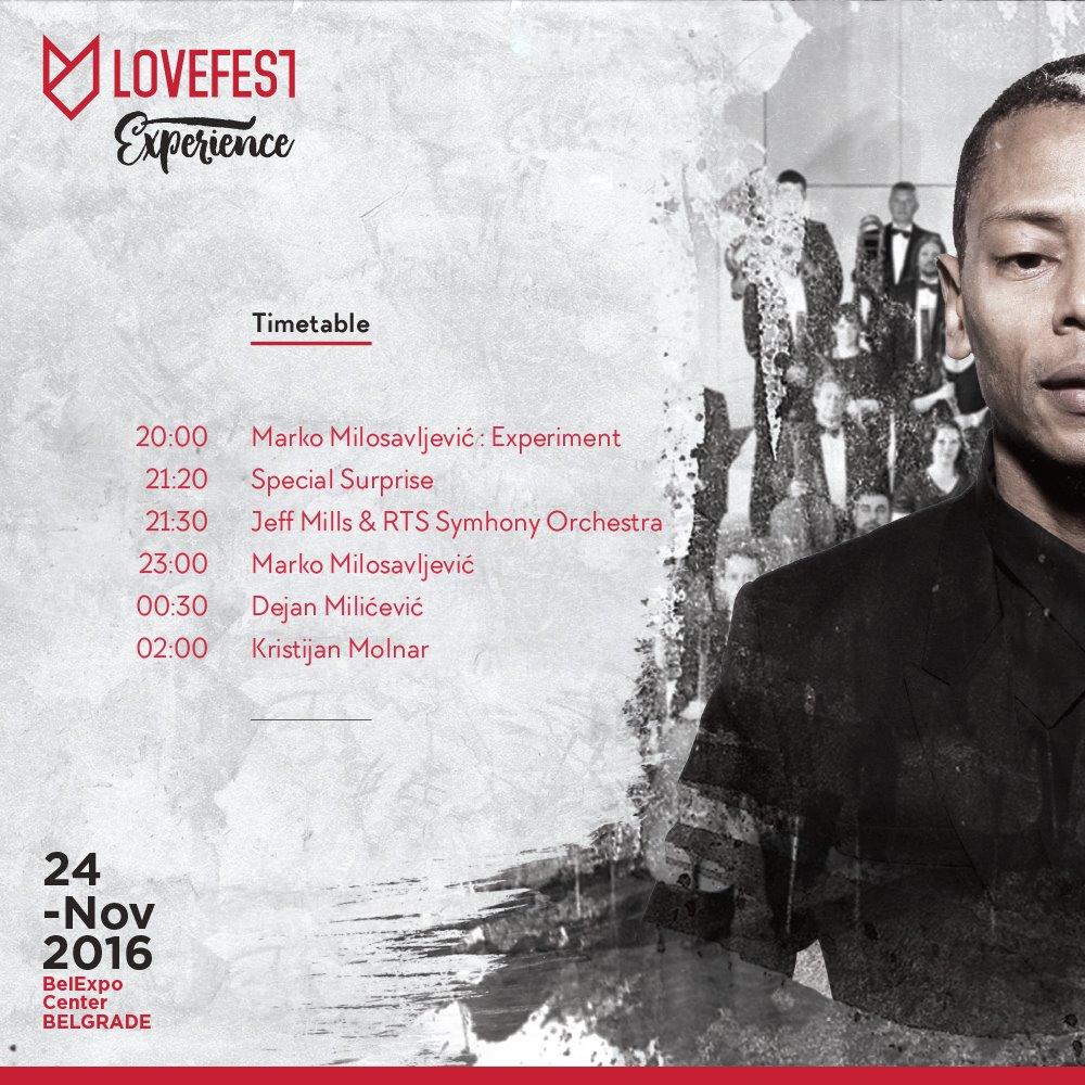Beograd, 23. novembar 2016. Lovefest Experience, dugo očekivani koncert svetske tehno legende Jeff Mills-a i Simfonijskog orkestra RTS-a počinje sutra u 21h u BelExpo centru u Beogradu.