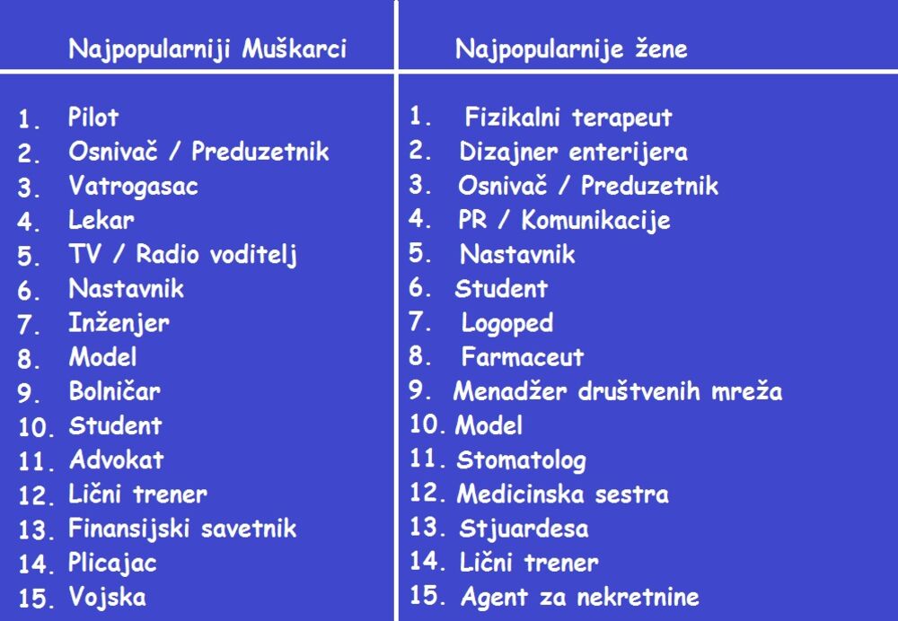 Žene se jako pale na „klasična“ muška zanimanja. Tako se na prva tri mesta nalaze: pilot, vatrogasac i doktor. Model je tek na 10 mestu kod žena, a kod muškaraca su manekenke na osmom mestu.