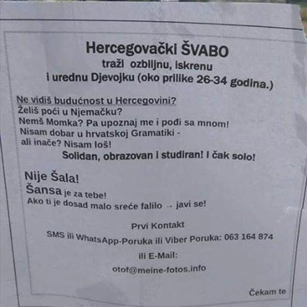- Ako imaš između 19 i 23 godine, nisi viša od 155 cm i imaš 43-47 kilograma, belkinja si ili možda egzotična mulatkinja, imaš posao, vozačku dozvolu, moderan automobil, redovno ideš u teretanu (bez devojaka koje su čas mršave, čas debele), ako imaš vaginu koja ne strči prema spolja, grudi veličine C, ako nemaš jeftine tetovaže, pirsinge na licu, nemaš bivših prijatelja s povlasticama, nemaš bivše mladiće koje znam ili za koje znam, ako si voljna preseliti se u Kanberu da budeš moja devojka, imaš dobru ličnost i smisao za humor, nikad se ne ponašaš razmaženo ili počinješ svađe oko ničega i ne postaneš ljubomorna kad ne dođem kući celi vikend... molim te, javi mi se -napisao je.