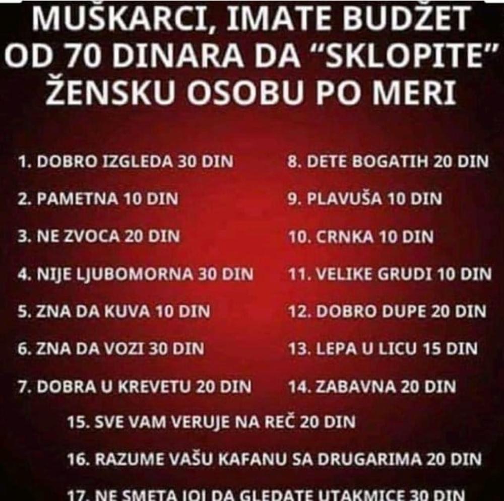 Naime, muškarcima je dat "budžet" od 70 dinara da sa tim novcem "sklope" idelanu ženu.