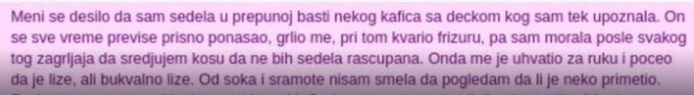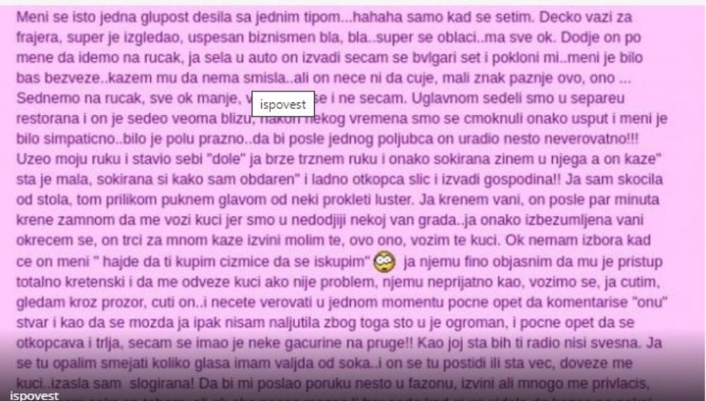 - Stigli smo u restoran, a on je uzeo moju ruku i stavio je sebi dole, ja brže trgnem ruku, a on kaže: "Šta je mala, vidiš kako sam obdaren!", otkopča šlic i izvadi gospodina, nakon čega sam ja krenula kući, a on se izvinjavao i ponudio se da me odveze. U automobilu se dogodilo isto to, na kraju je slao poruke i izvinjavao se, a zataim tražio da ga preporučim nekoj drugarici, kojoj će sve to možda odgovarati - ispričala je.