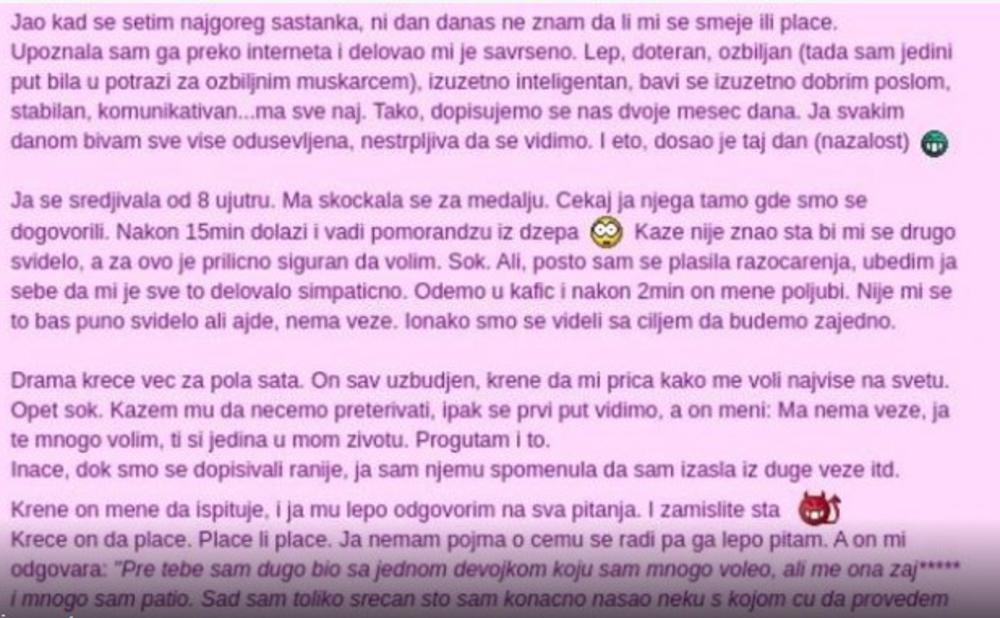 Mnoge žene mogu da se sete bar jedne situacije kada je prvi sastabaj krenuo u lošem pravcu i kada su se susrele sa sasvim neočekivanim ispadima mušakraca. Najgora iskustva sa prvih sastanaka pronašli smo na forumu Ana.rs gde su mnoge devojke iznele svoja iskustva.