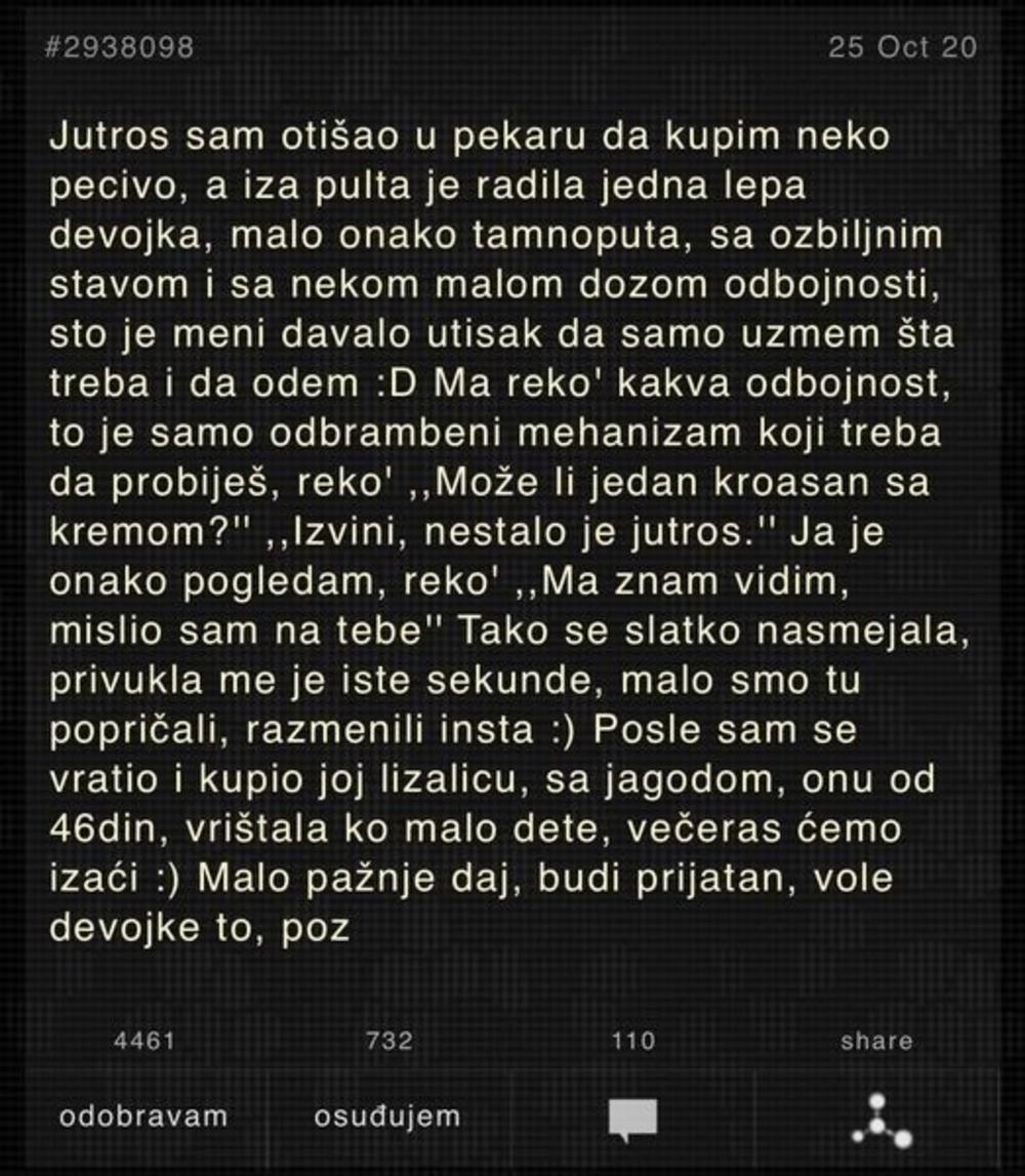 " Tako se slatko nasmejala, privukla me je iste sekunde, malo smo tu popričali, razmenili instagram. Posle sam se vratio i kupio joj lizalicu sa jagodom, onu od 46 din, vrištala ko malo dete, večeras ćemo izaći. Malo pažnje daj, budi prijatan, vole devojke to, pozdrav.