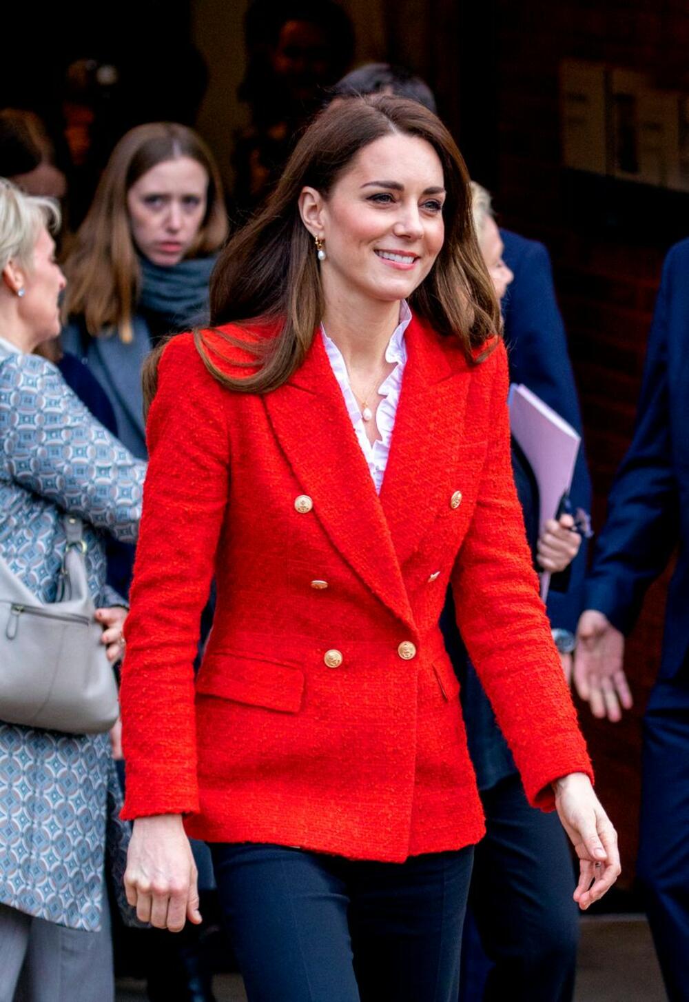 Ispod crvenog sakoa, Kejt je obukla belu košulju sa diskretnim volanima na okovratniku.