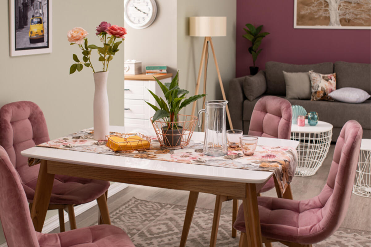 Roze boju možete primeniti na uređenju trpezarije, čime biste u ambijentu stvorili jaku, a opet ženstvenu atmosferu. Romantični ambijent možete upotpuniti roze trpezarijskim stolicama G603 sa dizajnom koji kombinuje štof i drvenu konstrukciju. Traka za trpezarijski sto u cvetnom dezenu mali je detalj koji će napraviti veliku promenu u izgledu ambijenta, a na ležaju u dnevnoj sobi možete dodati jastučnicu u istom dezenu. Vaza sa cvećem na stolu pravi je letnji detalj kojim ćete dodatno ukrasiti prostor.