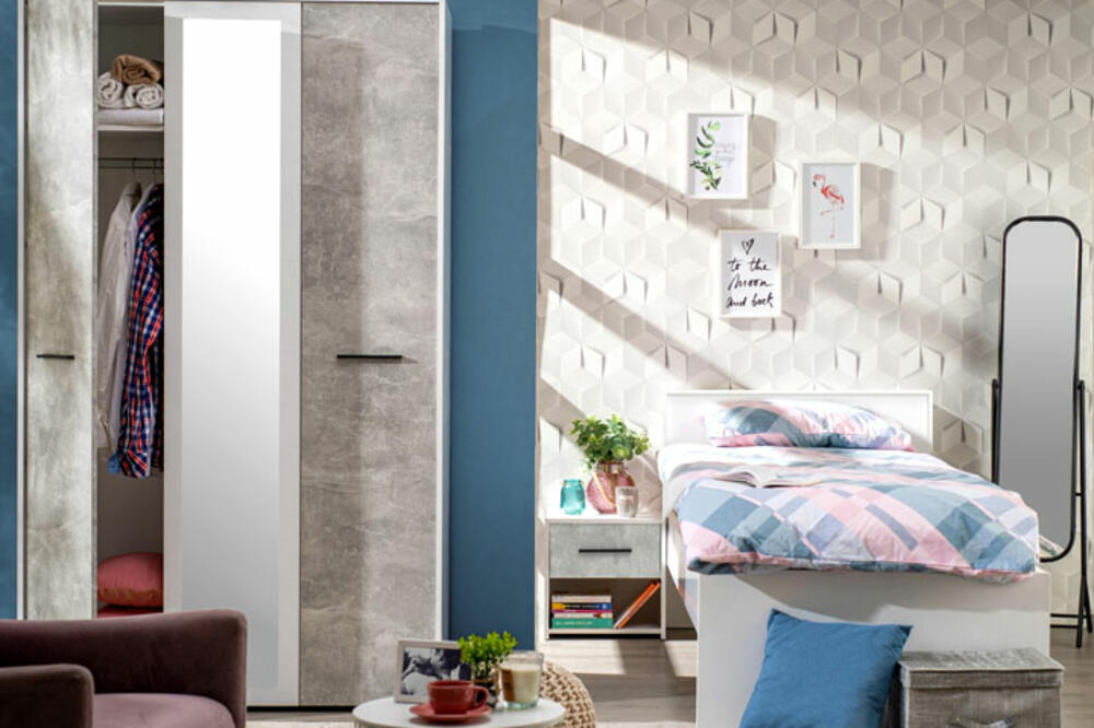 Nameštaj dizajniran u kombinaciji belog i beton dekora predstavlja idealnu kombinaciju za sve ljubitelje monohromatskog stila ili hladnijih tonova. Detalj za isticanje su crne ručice, koje uz beton dekor čine enterijer ovakve sobe upotpunjenim i elementima industrijskog stila, jednog od popularnijih kod mlađe populacije.