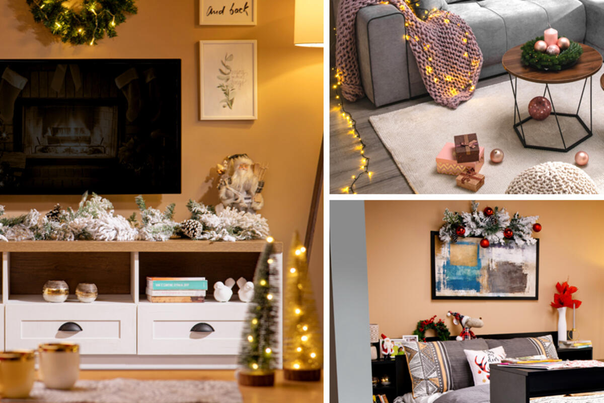 TV policu, poput TV police PROWANSJA možete dekorisati bogatim girlandama zajedno sa figurama Deda Mraza i novogodišnjih kugli u staklenoj posudi. Iznad televizora okačite novogodišnji venčić ukrašen NG LED lampicama, a na klub sto dodajte još dekoracije, poput patuljka i ukrasnih jelki sa lampionima.