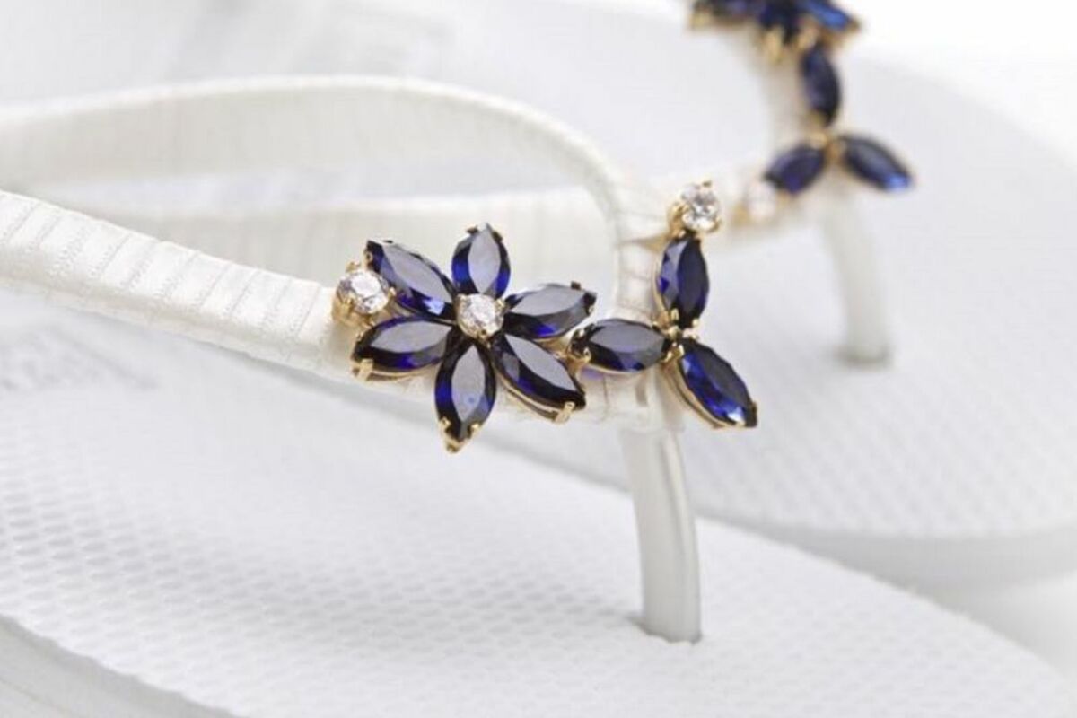 Safiri i zlato, ukupno 20 karata – ukrašava japanke italijanske marke „Beechic“ iz Livorna koje se proizvode u saradnji sa zlatarima iz Areca.