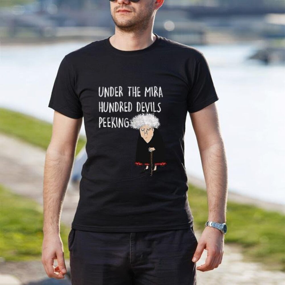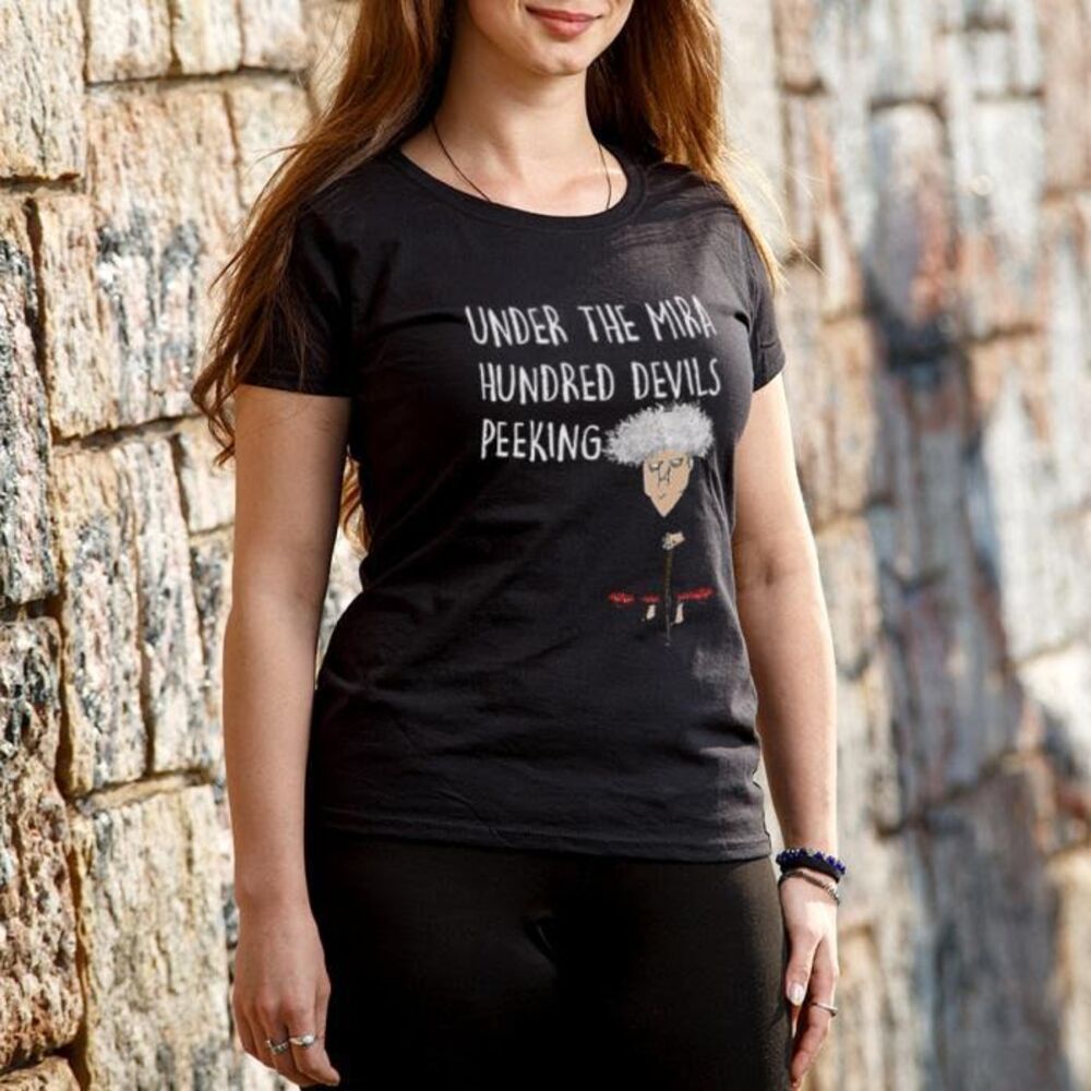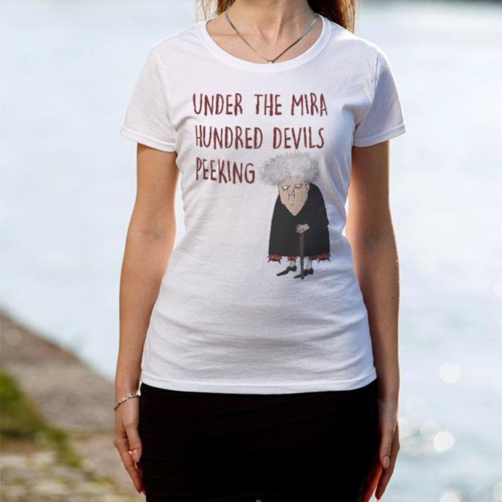 Neka na prvi pogled niko ne shvati šta je poruka, a nakon toga će sigurno shvatiti da sa vama ne smeju da se kače. NOSAM majice sa natpisom UNDER THE MIRA HUNDRED DEVILS PEAKING su jako popularne, i izazivaju mnogo reakcija. Idealne su za poklon, jer su originalne, prenose jasnu poruku, i predviđene su za sve Mire, ali i za one koji se tako osećaju. Majice su dostupne u crnoj i beloj boji, ali i u ženskom i muškom modelu. Ukoliko želite ovu hit crnu majicu, mušku ili žensku, možete je OVDE poručiti, po ceni od 1500 rsd, a ako je vašu pažnju više kupila bela varijanta, OVDE možete da naručite muški i ženski model po ceni od 1400 rsd.