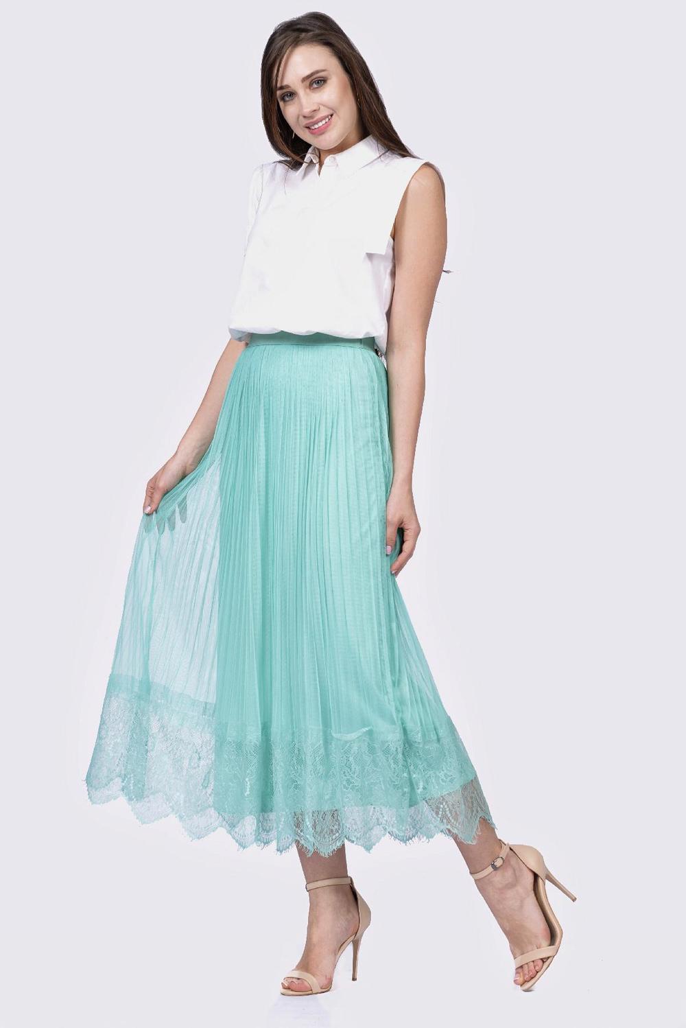Duge suknje su veoma aktuelne ove sezone! Duga plisirana suknja od tila sa čipkom je vrlo efektna i trendi. Plisirani til sa širokom čipkom na obodu daje joj sofisticiranu notu, a svežinu dobija iz vedrih i modernih boja kao što su mint i nar. Ovaj model suknje odlično pristaje svakom tipu građe. OVDE plisirana suknja može biti vaša, za 3390 rsd, ili pozivom na broj telefona 011/4420-502.