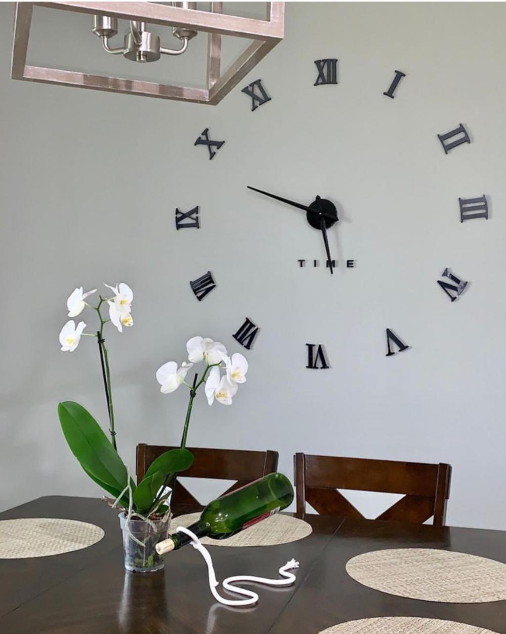 3D samolepljivi zidni sat dimenzija 1m X 1m, elegantnog izgleda sa crnim rimskim brojevima i kazaljkom od crnog aliminijuma savršen je za uređenje svake prostorije u vašem domu. Može da se lepi na sve podloge, a pri odlepljivanju ostavlja minimalne tragove na zidu.