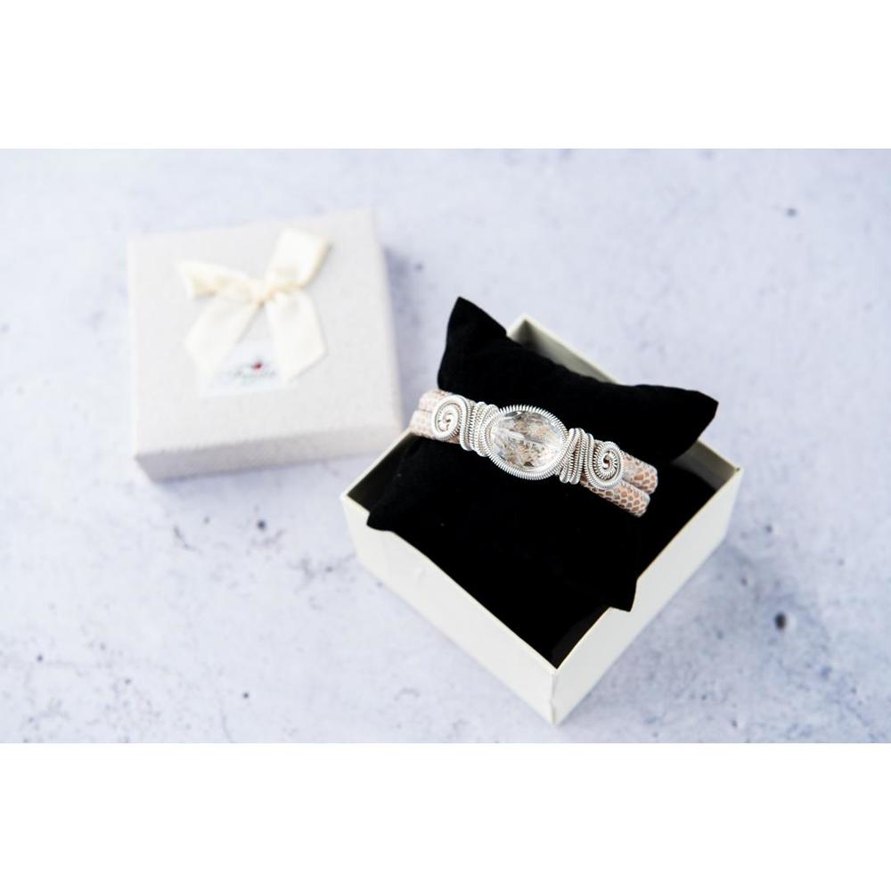 Narukvica boje kože sa providnim kamenom je sa zmija šarom i okruglim kamenom. Urađena od kože i pamučnog kanapa, posrebrene žice i finih kamenčića, elegantna je i bez nje nećete moći da zamislite večernji izlazak. Naručite je OVDE ili pozivom na broj telefona 011/442 0502 ili 064/866 00 55 svakog radnog dana od 9 do 17h, po ceni od 1.099 rsd.