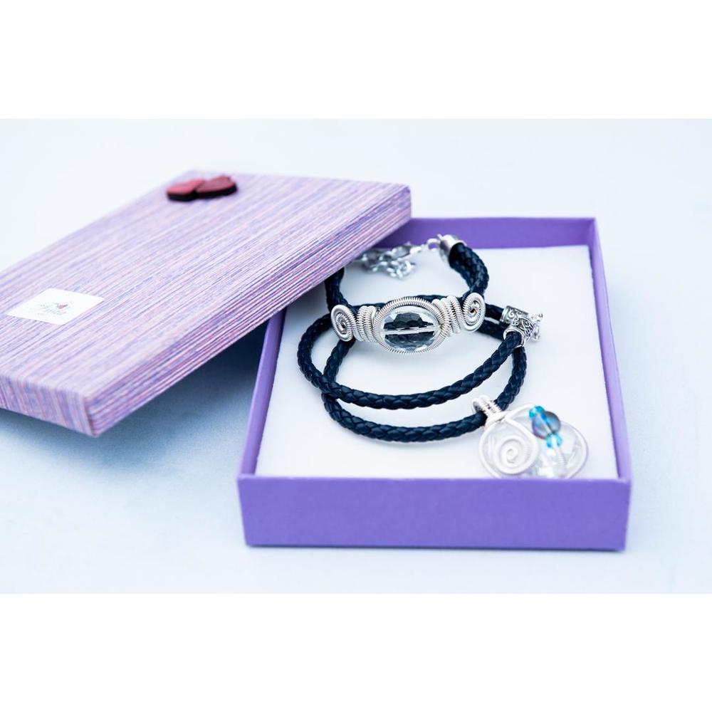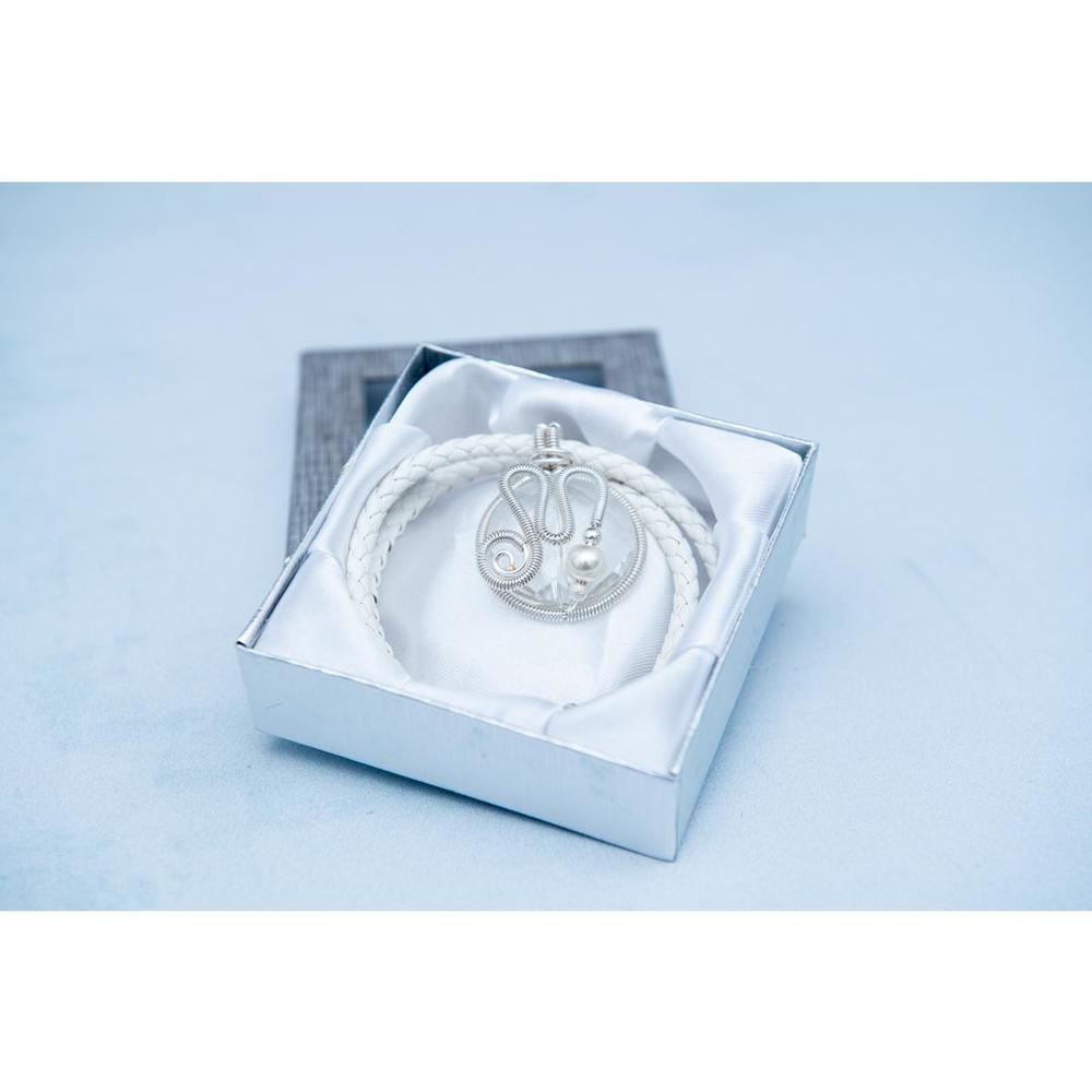 Komplet White Bride sastoji se od ogrlice i narukvice. Rađen je od prave kože, posrebrene žice i providnog kamena. Dužina ogrlice je 15 cm, a narukvica je podesiva i odgovara svakoj veličini zgloba. Daje vašoj odeći posebnost i unikatan, sofisticirani stil. Naručite ga OVDE ili pozivom na broj telefona 011/442 0502 ili 064/866 00 55 svakog radnog dana od 9 do 17h, po ceni od 2.100 rsd.