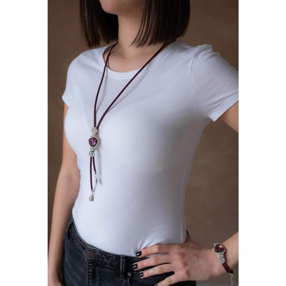 Ogrlica Purple Lady rađena je od kože, posrebrene žice, finog kamena i metalnih nastavaka u obliku kapljice. Njena dužina je 45 cm i kada je stavite oko vrata tačno je do dužine vašeg stomaka. Prikladna je za svakodnevno nošenje. Naručite je OVDE ili pozivom na broj telefona 011/442 0502 ili 064/866 00 55 svakog radnog dana od 9 do 17h, po ceni od 1.199 rsd.