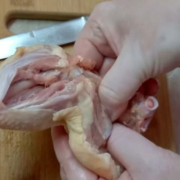 Već delimično odvojenu kost uhvatite i izvucite je na gore i daleko od bataka kako biste mogli da presečete ispod ostale kosti. Osetićete kako kost počinje da se opušta od karabataka. Napravite potrebne rezove kako biste u potpunosti uklonili kost od bataka.