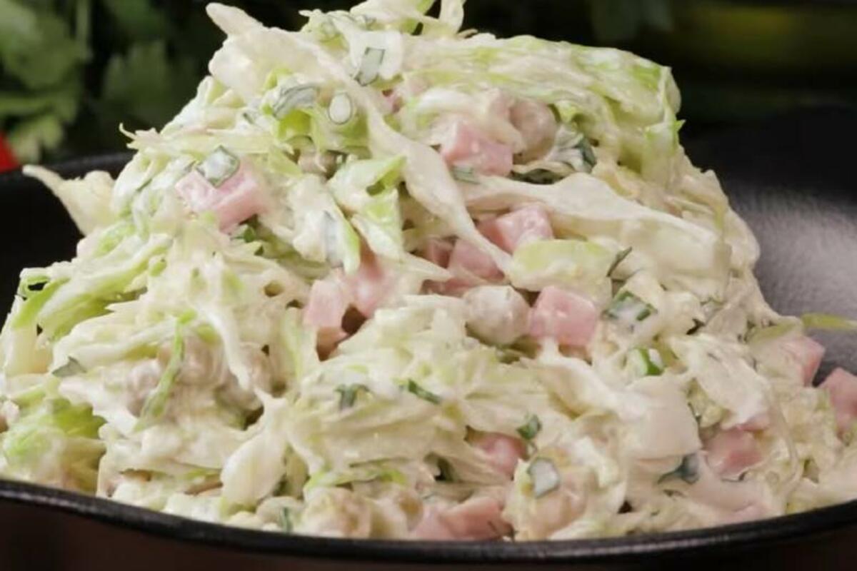 Kupus sitno iseckajte ili izrendajte. U posudi pomešajte šunku isečenu na kockice, grašak, secakni luk i peršun, maslinovo ulje, pavlaku i majonez. Malo posolite i dobro promešajte. Dodajte u kupus i lepo promešajte.