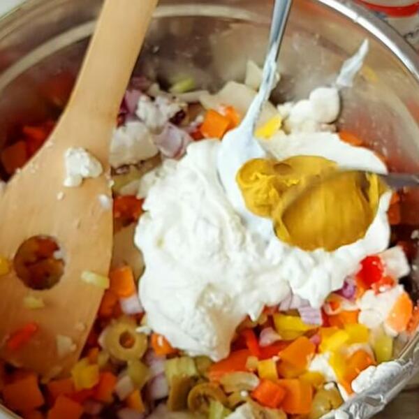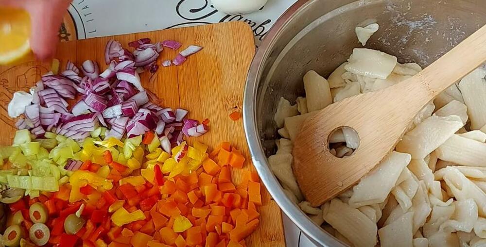 U skuvanu testeninu dodati sve nabrojane sastojke, testeninu iseckanu na kockice kao i sve ostalo