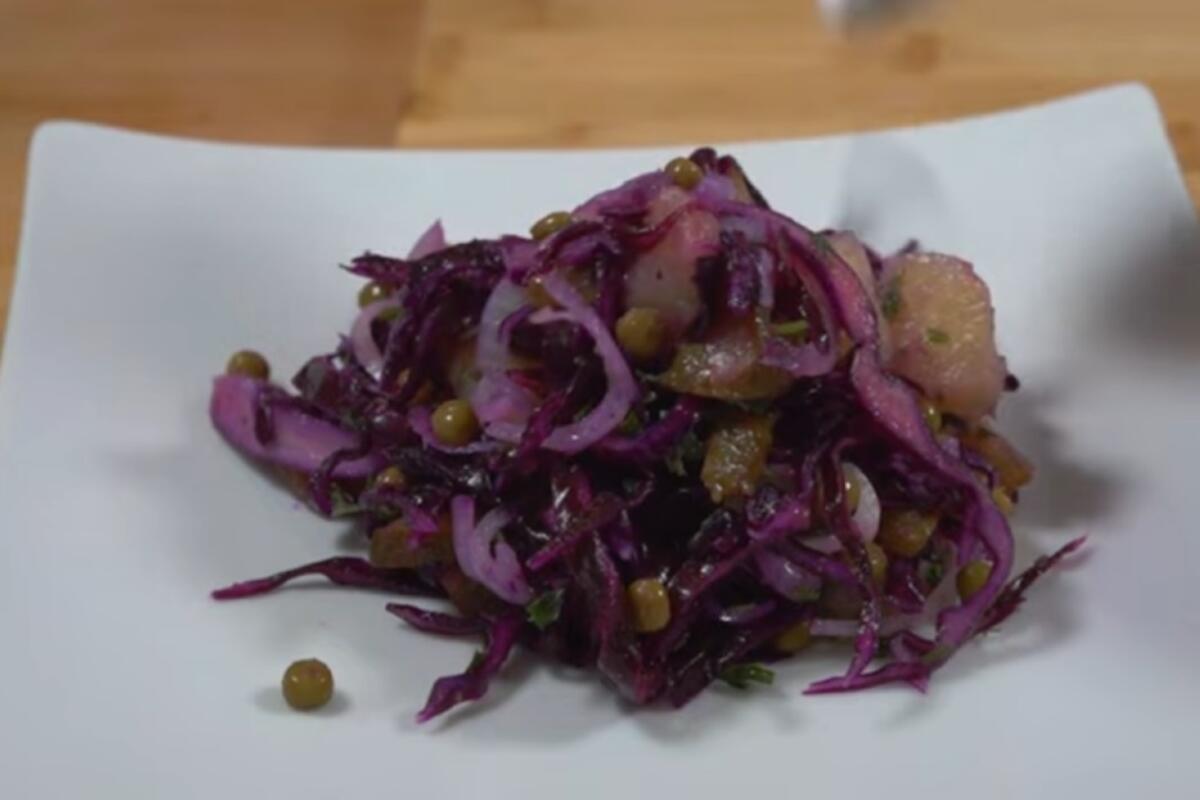 600 g krompira 300 g ljubičastog kupusa 1 crni luk 6 kiselih krastavčića 200 g graška iz konzerve 1/2 limuna mirođija peršun