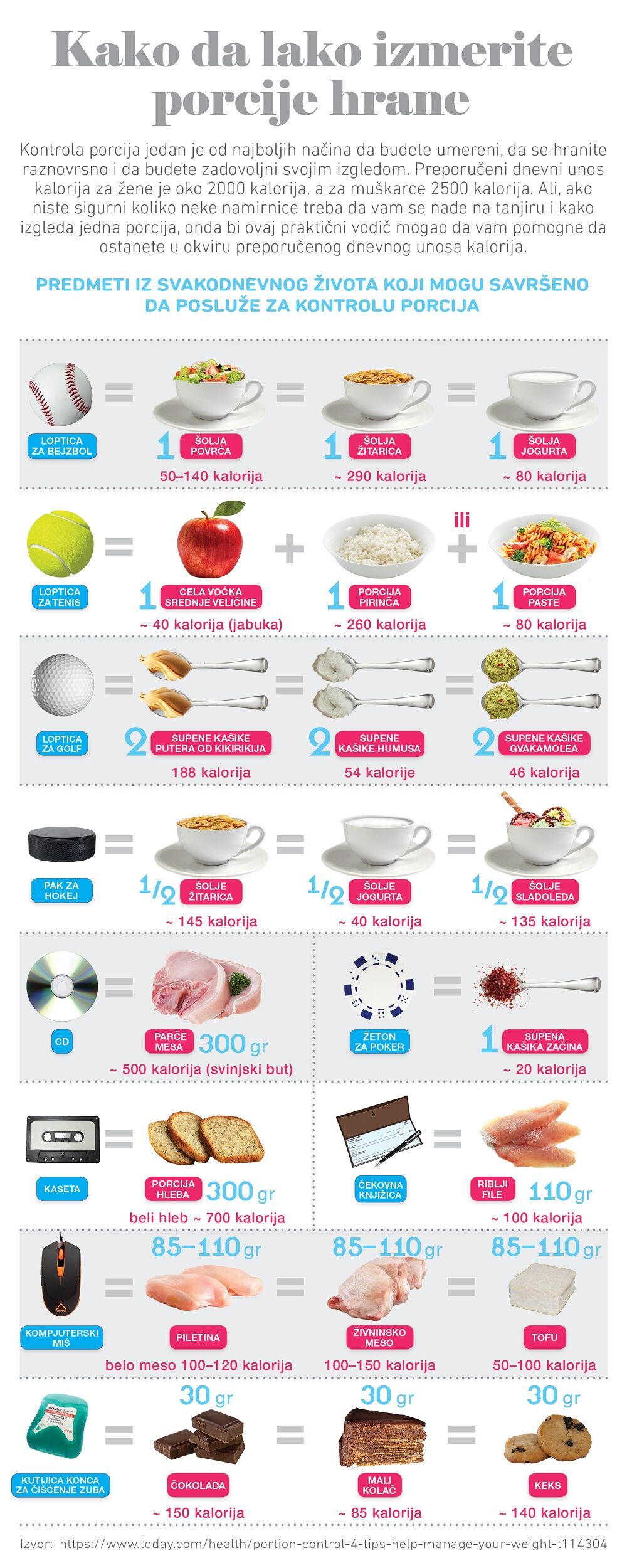 Ako znate da je preporučeni dnevni unos kalorija za žene oko 2000, a za muškarce 2500 kalorija, to će vam u startu olakšati posao, a uz ovaj slikoviti infografik ćete se lakše snaći i kada budete trebali da odmerite porcije hrane na svom tanjiru.