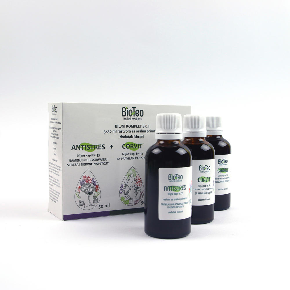 Biljni komplet Antistres + Corvit + Cirkul koji sadrži 3 biljne tinkture (bočice) možete poručiti klikom OVDE, po ceni od 2880 rsd, ili pozivom na broj 011/4420-502 radnim danima.