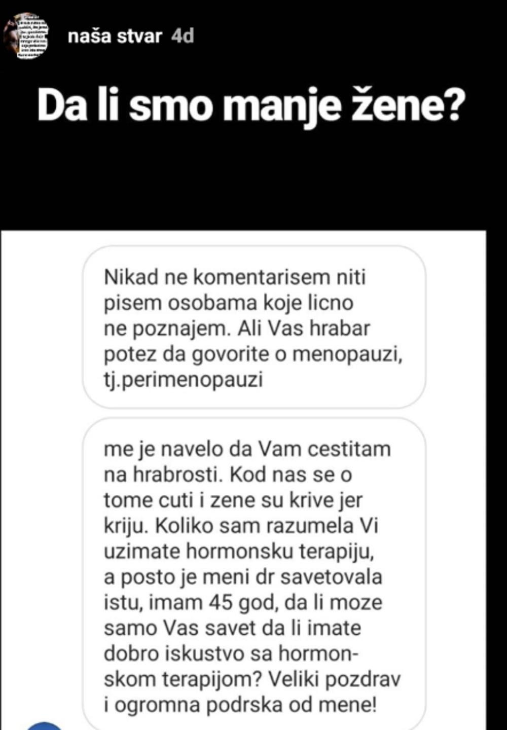Ani Ćubeli mnoge žene su dale podršku i istakle da o ranoj menopauzi i njenim simptomima treba više pričati. Jedna mlada žena se već sa 32 godine suočila sa ovim problemom, jer joj je konstantovano da su joj zalihe jajnih ćelija na izmaku, a u klinici za VTO su joj rekli da mogu da pokušaju, ali da su joj šanse skoro nikakve.