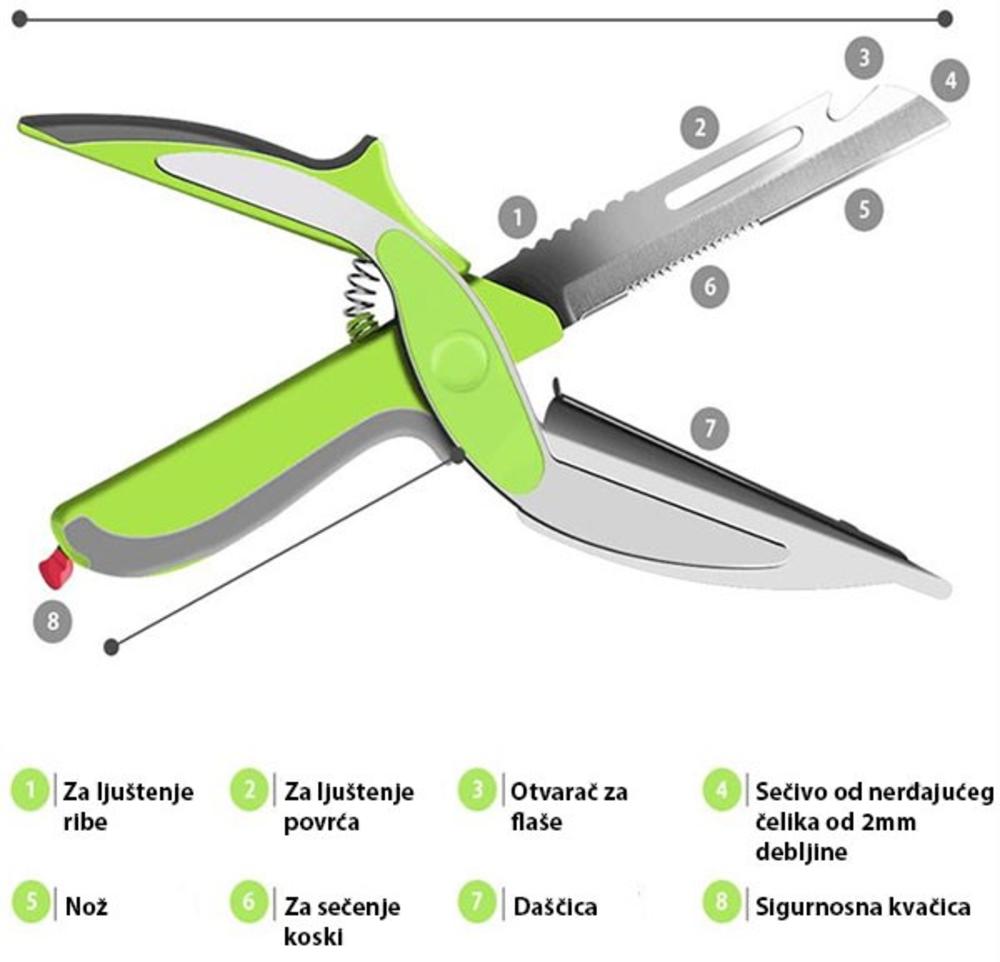 - pored sečiva mogu da budu i ljuštilica za povrće + ljuštilica za ribu + daščica + otvarač za flaše + sečivo za koske!