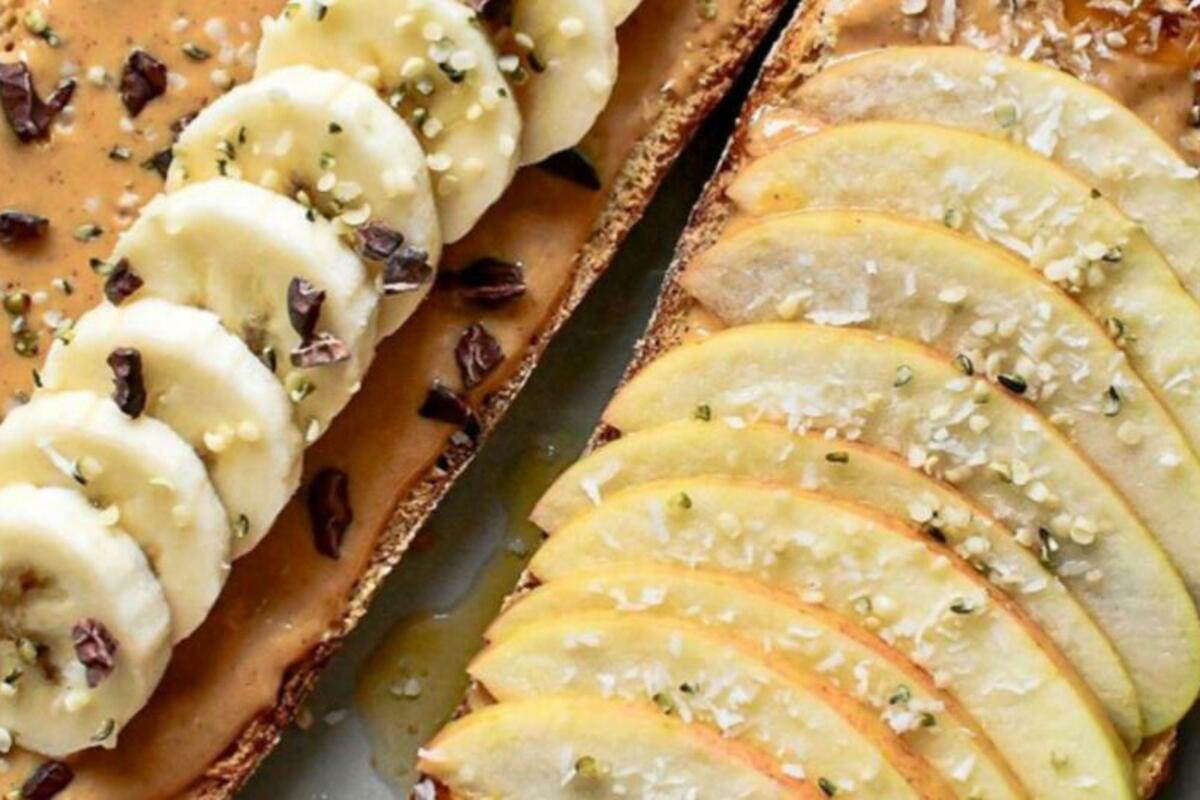 Banana, jabuka i maslac od kikirikija na tostu 2 kriške kruha, prepečene 4 kašike kremastog maslaca od kikirikija 1/2 banane, tanko narezane 1/2 jabuke, tanko narezane sirovi kakao, kašika meda ili javorov sirup, za ukrašavanje. Na svaku krišku prepečenog hleba dodajte po dve kašike maslaca od kikirikija, pa preko njega naslažite kriške banane i/ili jabuke i ukrasite zrncima kakaa, medom ili javorovim sirupom po želji. Prijatno!