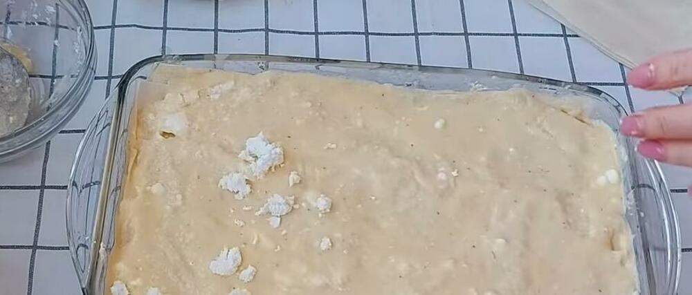 Jaja umutiti pa dodati ulje, kukuruzno brašno, hlebno sa praškom za pecivo - prosejano, kiselu vodu, sir...