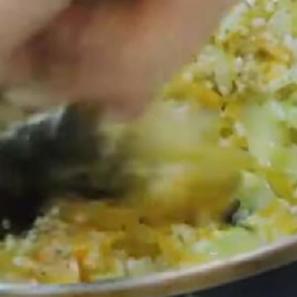 Posolite, dodajte opran pirinač i još kratko pržitie. Začinite sa pola kašičice crvene mlevene paprike i biberom, pa promešajte i skloniti sa vatre.